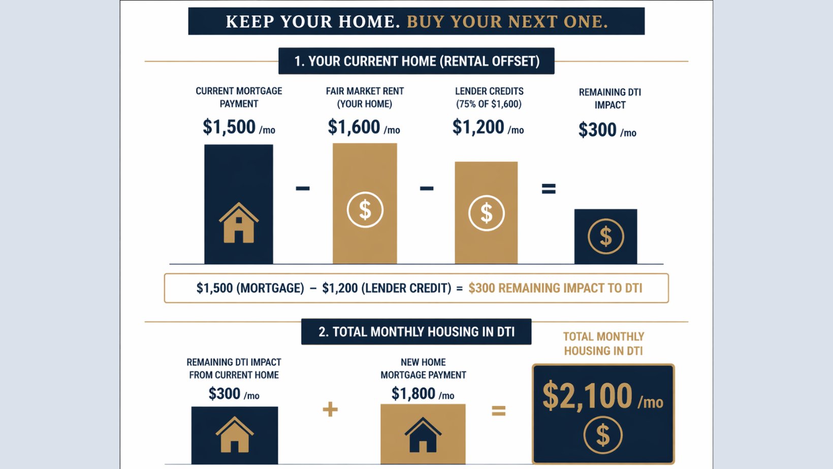 A: It doesn’t have to. Even a partial offset can make the difference in qualifying. If your mortgage is $1,500/month and the 75% rental credit covers $1,200, you’re only carrying $300/month of that mortgage in your DTI. That partial reduction is often enough to get qualified for the next home.