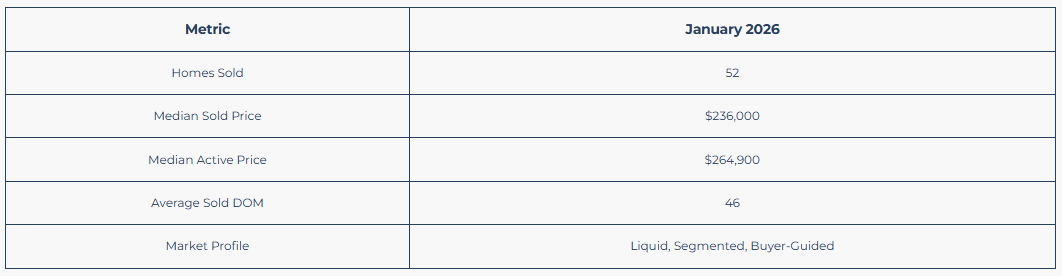 As the largest and most liquid housing market in Houston County, Warner Robins always reactivates quickly after the holidays. But January didn’t produce chaotic competition or broad price escalation. Instead, it revealed something more instructive: buyers returned with clear rules, and the market respected them.