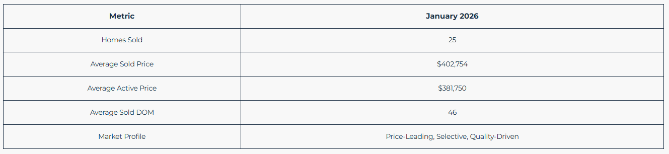 The average sold price ($402K) exceeded the average active price, showing buyers were willing to pay strong numbers — but only for homes that met expectations around layout, finishes, and location. Listings that missed those expectations accumulated time rather than forcing price cuts.