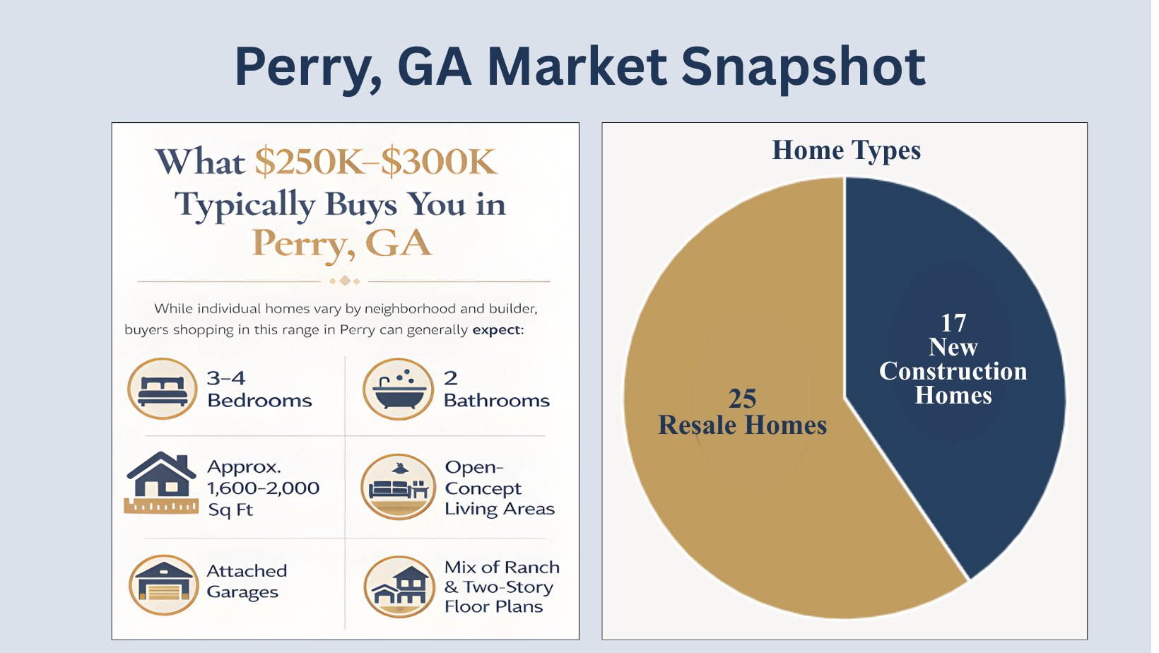 Below is a clear, local breakdown of what buyers can realistically expect when shopping for homes in Perry, GA in the $250K–$300K range.