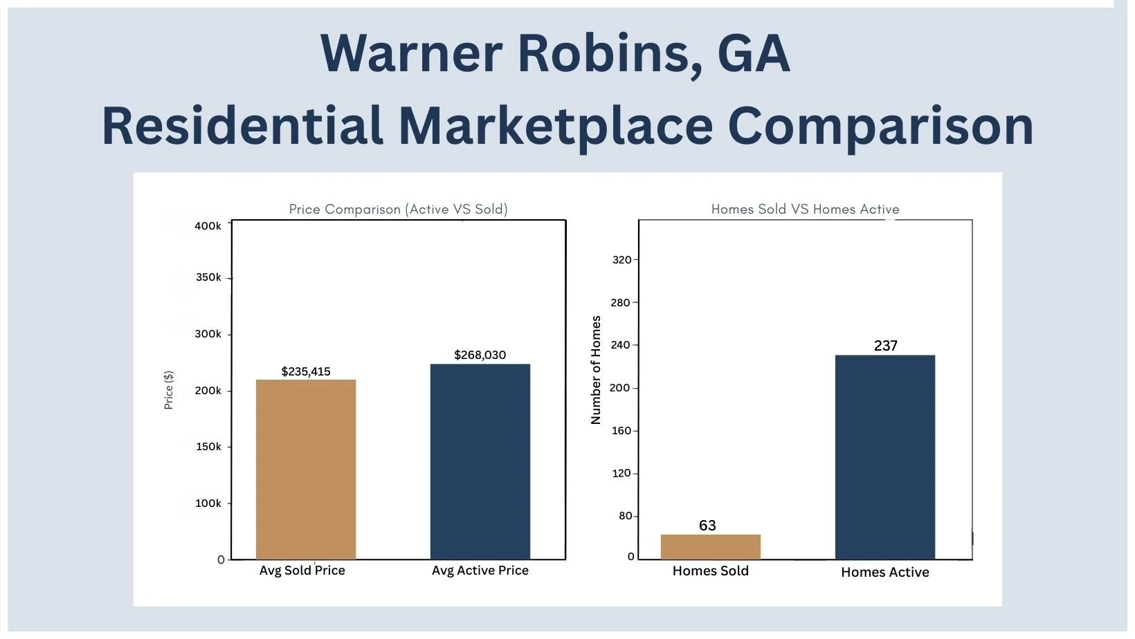The difference between active pricing ($268K) and sold pricing ($235K) reflects a familiar pattern in Warner Robins: sellers test the market slightly higher, while buyers anchor decisions to comparable sales.